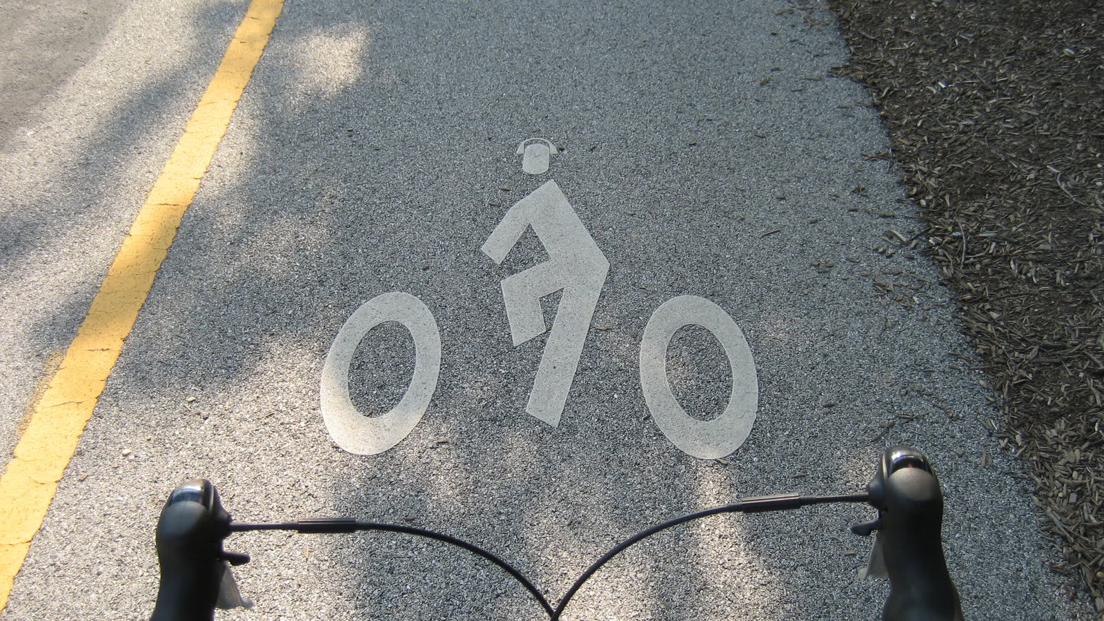 I couldn't help but wonder (enough to actually stop and take a picture) if they were suggesting that only cyclists wearing headphones could use the path. It sort of makes sense, as I wouldn't be comfortable on the street with headphones on, I like hearing the cars coming behind me in lieu of a rearview mirror.